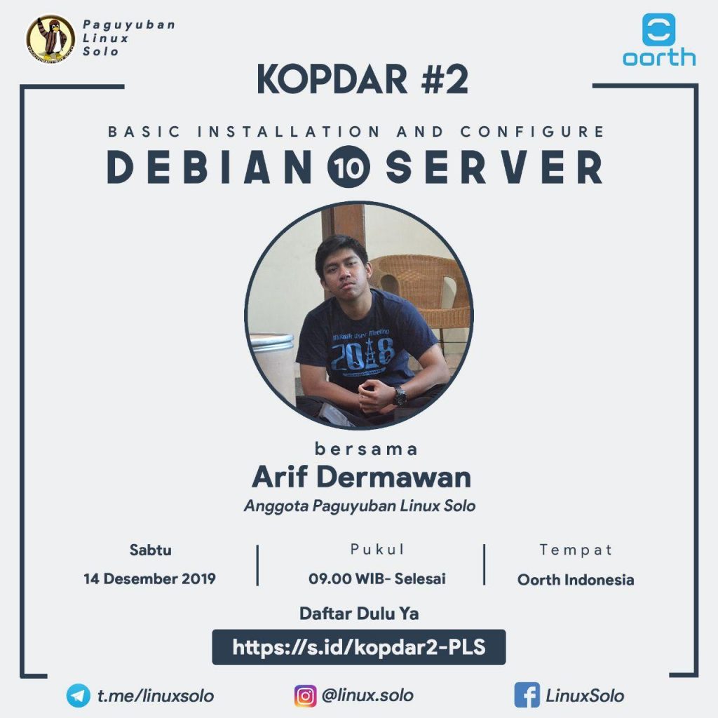 Halo ! Pecinta Linux se-Solo Raya, pripun kabare sedoyo ? 😁 Alhamdulillah sehat sedoyo nggih… Paguyuban Linux Solo mau ngadain kopdar kedua nih. Dikopdar ke dua ini kita akan mendatangkan pembicara dari anggota paguyuban linux solo yang bertajuk Kopdar #2 “Basic Installation and Configure Debian 10 Server”, kopdar ini sebnernya lebih khususon kepada para pemula